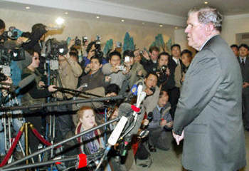 关于朝核问题,李肇星说,中方坚持维护朝鲜半岛的和平与稳定,支持朝鲜半岛实现无核化,不赞成在半岛上出现核武器,主张通过对话和平解决问题。中方不赞成朝方退出《不扩散核武器条约》(NPT)。