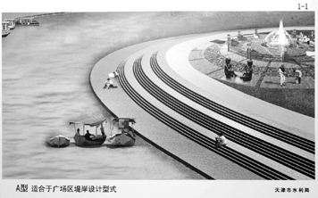 在规划中,大多数地段的堤岸断面结构形式均为退台式护岸,以体现亲水性;个别地段因条件所限堤岸线无法向后退移的,如凯悦饭店、移通大厦附近,则仍采用直立式护岸。
