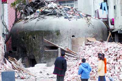 据人民网报道,汉口建设大道旁金惠公寓居民刘先生昨日凭栏远眺时,突然发现建设大道拓宽工程拆迁处露出一座三四米高,如天文台顶一般的圆顶庞然大物,仔细观察,竟是一座碉堡。