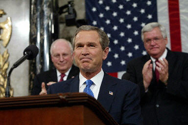 在当地时间周二晚间发表的国情咨文中,布什表示:“有人说在危机来临的时候,我们再作出反击。难道等恐怖主义分子和暴君表明了他们的意图后,我们再关注他们的进攻吗?如果威胁突然出现,那么所有的行动,所有的话,所有的自责,都已为时已晚。”他表示,“相信萨达姆心智健全,认为他会容忍克制的想法是不合适的。”