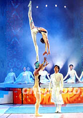 中国新秀魏葆华和吴正丹在北京春节晚会上表演杂技《梁祝·化蝶》,此节目曾经获得第二十六届蒙特卡罗金小丑芭蕾舞金奖。作者:王新