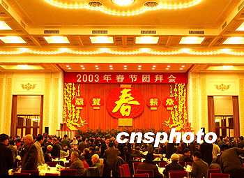 中新网北京1月31日电(记者 齐彬)中共中央、国务院今天上午在人民大会堂举行二00三年春节团拜会,江泽民、胡锦涛、李鹏、朱镕基、李瑞环、李岚清、吴邦国、温家宝、贾庆林、曾庆红、黄菊、吴官正、李长春、罗干等领导人同首都各界人士四千五百多人欢聚一堂,辞旧迎新,共庆中国人民的传统节日。