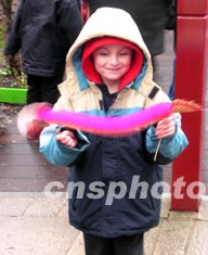 农历新年,英国曼彻斯特唐人街举行盛大贺岁活动,图为英国小童饶有兴趣地玩“中国龙”。 卢峰 摄
