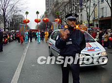 法国六十多个华人社团欢天喜地庆新春,联合组织的彩妆巡游在巴黎十三区举行。法国警方为华人新春彩妆巡游开道。作者:蔚中