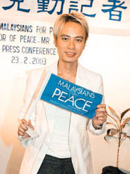 中新网2月25日电 香港歌手李克勤日前被邀往马来西亚吉隆坡担任当地举行的“反战音乐会”嘉宾,他是唯一一个来自香港的歌手,获得当地有关部门颁发的“和平大使”锦旗,克勤笑言自己像是香港小姐得奖。