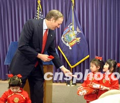 纽约州州长柏塔基二月二十六日在其位于纽约曼哈顿中城的办公室举行仪式,向亚裔社区恭贺羊年新春。柏塔基按照华人的传统习惯给前来表演助兴的华裔儿童发“贺岁红包”。作者:赵海燕