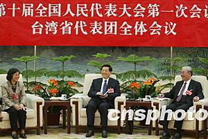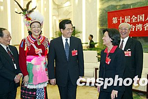 胡锦涛向台湾代表团的各位代表,并向广大台湾同胞致以诚挚的问候。会场上,发言踊跃,亲情融融。胡锦涛认真听取大家的发言。他说,中共十三届四中全会以来,我们坚持“和平统一、一国两制”的基本方针,应对挑战,排除干扰,大力推动对台工作,取得了重大成果。国际社会普遍坚持承认一个中国的基本立场,两岸关系的基本格局和发展趋势没有改变。这是以江泽民为核心的第三代中央领导集体正确决策和坚强领导的结果,是包括台湾同胞在内的全体中华儿女共同努力的结果。