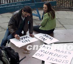 三月十七日在联合国安理会为避免战争竭尽所能之时,守候在联合国大楼外的反战者书写反战标语,为阻止战争做最后努力。作者:赵海燕
