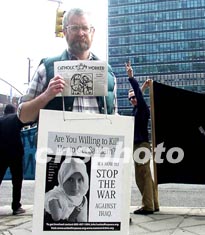 当地时间三月十七日上午,联合国内伊拉克问题上的外交斗争正式结束。美、英、西宣布,放弃在安理会上对伊拉克最后通牒议案进行表决的努力。在联合国总部门前,一名反战者身挂伊拉克残疾少女画像的表语牌,上书:“为抓住萨达姆,你想杀死她吗”?作者:陈