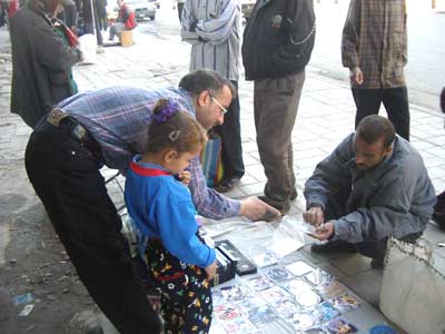 巴格达市民在买盗版美国大片VCD,大概4元人民币一张。(春风)