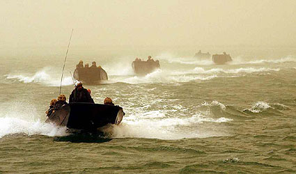 英国海军陆战队突击兵和美国海军陆战队员们想重演二战时西西里岛登陆战的场面,可伊拉克军队却不配合:当地时间20日晚,科威特北部的美英重炮部队、阿拉伯湾北部水域的海军舰炮、巡航导弹和美国航母起飞的舰载机同时对伊拉克第二大城市巴士拉的战略门户――法奥半岛进行了煞有介事的狂轰滥炸。