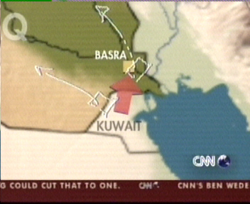 来不及多理他们,步3师的10000余辆坦克,装甲车,卡车向伊拉克一方涌去。由于万辆军用车辆绞起的阵阵黄沙,所以全体官兵们不得不用围巾包住自己的脸,以免吃进黄沙。在滚滚沙尘中,唯一看得清的就是前车的一对后红灯。陆3师在向伊阵地开前前,他们的师长告诉他们说,全师官兵将从8至12个地点同时向伊拉克境内推进,全体官兵应该带够能维持5至7天的口粮和饮用水,并且要求他们每天只能喝3升水。显然,该师是想一口气打到巴格达城下。