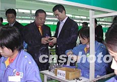 泰国华人青年商会潮汕地区经济文化访问团三月二十八日在广东汕头参观奥迪玩具实业有限公司。该公司总经理蔡东青(后左三)向访问团团长李桂雄(后左二)介绍情况。作者:王惠存