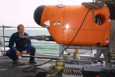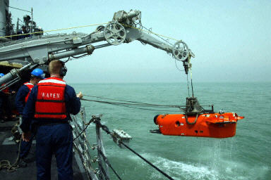 30日,美军舰“掠夺”号使用水雷压制装置在伊拉克南部乌姆盖斯尔水域执行扫雷任务。