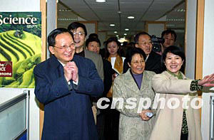 中国新任国务委员唐家璇十日在国务院侨办主任陈玉杰陪同下,到中国新闻社考察指导工作时,向中新社的新闻工作者表示致意。作者:毛建军