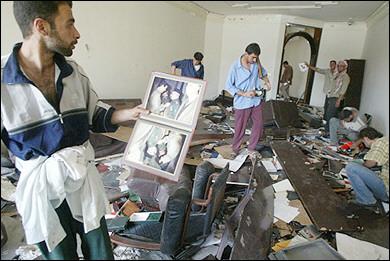 萨达姆的宫殿被脚手架包围,毫无疑问在两周之前,被一枚2000磅的炸弹击中之前仍然还在建设之中。散落一地的是那些罗马风格的裸体雕塑,陶瓷狮子雕塑等等。