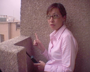 闾丘躲在楼顶角落为总部作联线报道