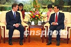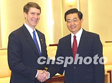 四月二十一日,中国国家主席胡锦涛在人民大会堂会见由参议院多数党领袖比尔·弗里斯特率领的美国参议院访华代表团。