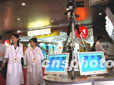 为预防“非典型肺炎”,二十五日开馆的广交会二期在展馆内外设置众多“红外测温仪”预防“非典”。作者:柯小军