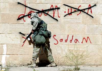 就在地面部队采取“搅局”行动时,空中的武装直升飞机也盘旋警戒,似乎萨达姆就隐藏在人群中一样。美军在坦克掩护下,用铁丝网在街头设立临时检查站并仔细搜查过往车辆。为了清除萨达姆的“余威”,美军使用斧子把这位领导人的画像砸烂,接着出动大批官兵把街道两侧墙壁上书写的反美标语清除干净。路透社记者发现,其中好些竟然是用英文写的“萨达姆万岁,布什是小狗”等等“大不敬字眼”。据说,此前一天晚上,当地美军曾经遭到子弹和迫击炮骚扰。