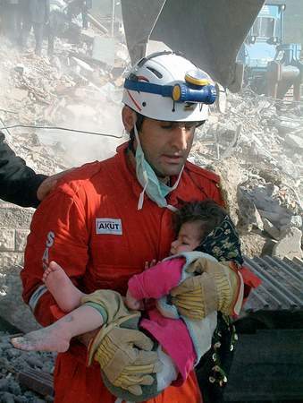穆斯塔法以及同宿舍的孩子们是幸运,可更多的同学就没有他们这么走运了,因为四层高的宿舍楼整个儿塌了下来,把140多个中小同学全都活活地埋进了废墟,一些孩子就在睡梦中被塌下来的水泥梁住活活砸死,更多的孩子则被困在了废墟中。与此同时,巴克尔市到处传来房屋和桥梁倒塌的消息,宾格尔省省长阿里-科斯堪告诉记者说,总共有25幢房屋和1座桥座倒塌,当地的输电塔和电线杆悉数倒塌,整个地区的电力和电话通讯全部中断。有数百人受伤或者被埋在废墟中,其中要数巴克尔市郊的寄宿学校情况最为严重。