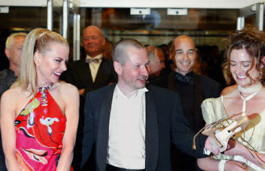 19日,丹麦导演冯特里尔的影片《道格镇》(Dogville)在戛纳电影宫的卢米埃尔大厅放映。影片剧组在首场记者观摩后举行了新闻发布会,导演冯特里尔(中)、女主角妮可-基德曼(左)等出席了记者会。