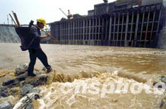 三峡水库坝前水位六月三日十二时许升至一百一十三米高程。位于三峡坝区右岸地下电站机组进水口开始进水。图为三斗坪中堡村移民庄德新正走过机组进水口施工现场。作者:孙荣刚