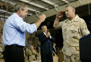 布什对2000名欢呼的美国空军、海军和陆军军人说:“这个人(萨达姆)花了数十年来隐藏他的大规模谋杀工具,他用来隐藏这些武器的地方很多,我们将寻找,我们将揭示事实。任何一个恐怖组织都将不能够从伊拉克获得大规模杀伤性武器,因为这一政权已经崩溃。我们确保了伊拉克不会成为恐怖组织的武器库。在伊拉克仍存在着零星的犯罪现象,联军正在伊拉克各地采取强有力的措施来使秩序恢复正常。美国和我们的盟国在使伊拉克的大街变得越来越安全。”