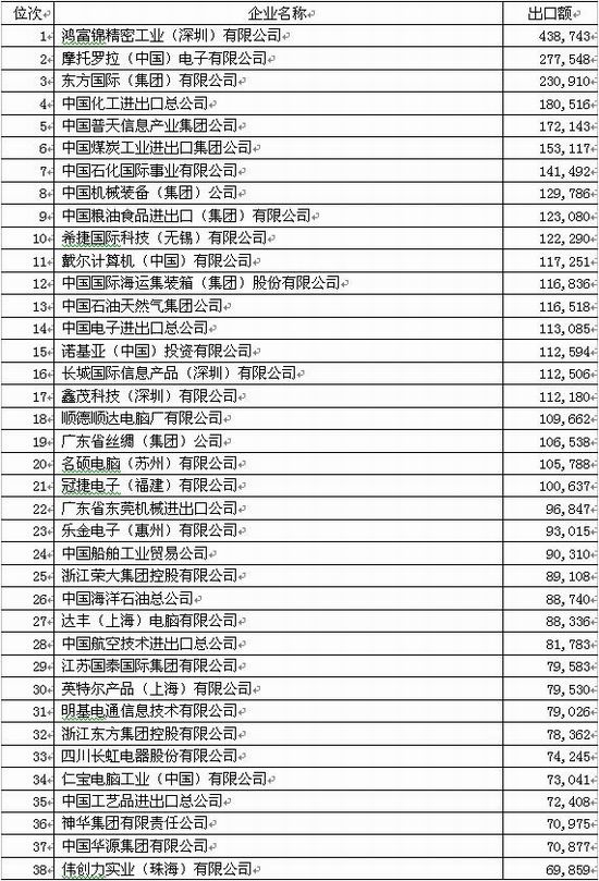 鸿富锦精密工业(深圳)有限公司出口额达43.9亿美元,增长115.9%,列200家之首;摩托罗拉(中国)电子有限公司出口27.8亿美元,增长72.1%,排名由上年的第7位上升到第2位。鸿富锦精密工业(深圳)有限公司和摩托罗拉(中国)电子有限公司还分别以进出口79.2亿美元和53.9亿美元列进出口额最大的500家企业的第2和第4位。