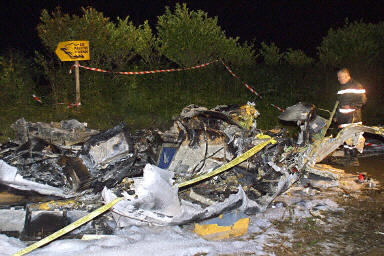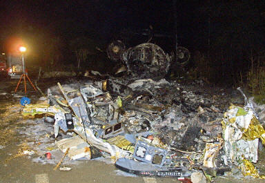 飞机坠毁后断成两截,机身随即起火。机上53岁的飞行员死亡,另一名机师及两名乘客受轻伤。