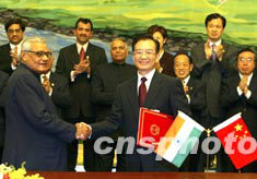 中新社北京六月二十三日电 中国国务院总理温家宝与印度总理瓦杰帕伊二十三日晚在北京人民大会堂共同签署了《中华人民共和国和印度共和国关系原则和全面合作的宣言》。