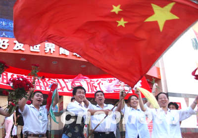 六月二十四日,世界卫生组织撤销对北京的旅行警告,并将北京从非典疫区名单中删除。王府井街头观看直播的保安获悉消息,挥旗相庆。 中新社记者:武仲林