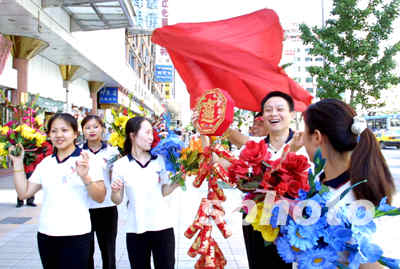 北京二十四日正式解除旅游警告,王府井街头欢歌一片,市民高举红旗、鞭炮、鲜花喜庆北京萨斯疫情获得阶段性胜利。中新社记者:廖文静