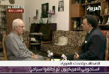 萨哈夫在电视上露面的时候身穿合体的便装,唯一的变化就显得瘦了,头发也一下子白了很多。这跟先前一身军装,贝雷帽下的头发黑的发亮的萨哈夫新闻部长的形象显得很不一样。(徐冰川/闻新芳)