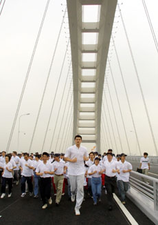 上海卢浦大桥28日上午正式建成通车,小巨人姚明带领千名中外长跑爱好者参加了主题为“活力上海,奔向未来”跨桥长跑活动。中新社记者 汤彦俊摄