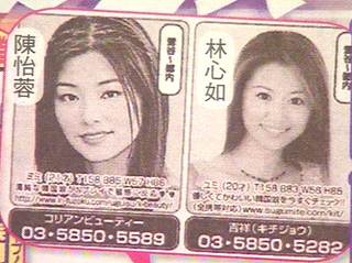 中新网6月30日电 在日本最新一期成人八卦杂志《周刊实话》中,0204号的小广告中竟然赫然出现了中国台湾玉女偶像陈怡蓉及林心如的照片,她们不仅被说成是韩国女生,还被冠上了不实年纪及三围尺寸。