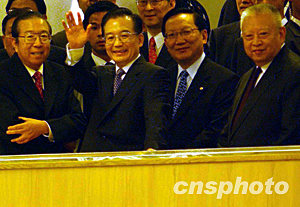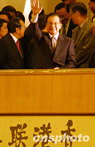 温家宝甫走入会场,即向在场人士挥手致意,且和很多工作人员握手,还与一些工作人员亲切交谈,有工作人员要求和温家宝合影,他也满足了他们的要求。温家宝穿上一件编号“6638”的红色出市背心,这是一组喻意好运的数字。