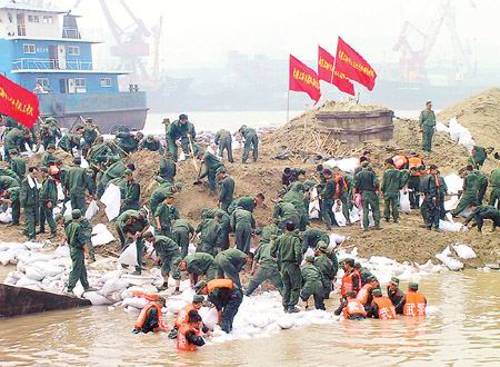 记者今天上午在现场看到武警上海总队第9支队3中队的数百名官兵身穿桔红色救生衣,有的在码头上搬运沙袋,有的站在齐腰深的积水里修筑堤坝。这些战士们从昨天凌晨进入现场抢险后,分批投入战斗,至记者发稿时已经连续战斗了30多个小时。