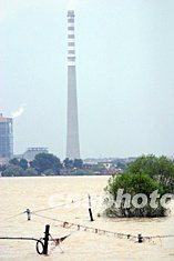 七月十一日,淮河水位上涨,淮河沿岸多处地区出现险情,如果出现溃堤,淮南的发电厂、煤矿等都将受到巨大损失。图为即将没顶的电线杆与发电厂隔堤相望。中新社记者:盛佳鹏