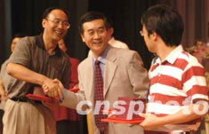 首都医科大学宣武医院院长张建(中),十八日在北京举行的“宣武医院抗击SARS大捷庆功大会”上,向新华社、人民日报等参与采访抗击SARS一线医护人员的三名记者,授予宣武医院永久院员荣誉称号,并颁发证书和奖品。中新社记者:邹宪
