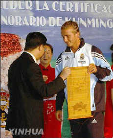 7月28日,皇家马德里队队员贝克汉姆(右)从昆明市市长手中接过荣誉市民证书。新华社图