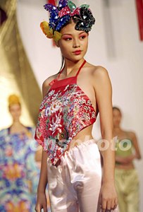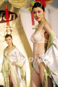 八月一日,“欧迪芬2003年‘魅力十射’内衣文化节”在北京新东安市场举办首场内衣秀,模特向观众展示一款风情十足的精品系列内衣。中新社记者:盛佳鹏