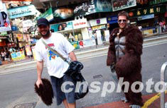 8月3日,外国游客打扮成“大猩猩”在香港时代广场一带消遣玩乐,引来不少途人围观。中新社记者:洪少葵
