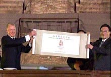 载着奥运会会徽的车辆从中华世纪坛出发,经过长安街,经过半小时的运送经达天坛,由邓亚萍和成龙护送进入现场。