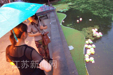 2003年8月3日晚至4日凌晨,南京莫愁湖公园推出“迎七夕莫愁湖放灯游园晚会”,数千游客冒雨与会。细雨中,对对情侣相依相偎,更添温馨。