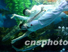 中国北方海滨名城大连新建的海洋公园,在渡过今春抗击SARS的旅游淡季后,如今每天表演的水下梦幻婚礼,满池鲨鱼好似一对新人的伴郎和伴娘,吸引各地观众场场客满。中新社记者:贾国荣