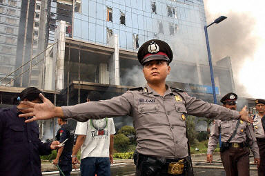 爆炸发生后,浓烟烈火从酒店的地下层冒出来。爆炸已经摧毁了一个酒店里的一家餐厅,酒店的大堂也部分受损。酒店的大堂以及门口停放的8辆汽车在燃烧。酒店及附近一幢高楼的多个楼层窗户的玻璃被震碎。印尼《罗盘报》的一名记者说:“我看见几辆出租车在燃烧,我相信是汽车炸弹引起了爆炸。八名受伤的人中有外国人。”
