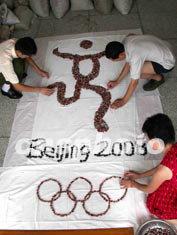 江苏南京雨花石收藏家曹萍用两天时间,从十万枚雨花石中精选出直径二至三公分的二00八枚精品雨花石,制作了一幅长二点五米、宽一点八米的北京奥运会徽,以表达祝愿北京奥运会成功举办的美好心愿。作者:陈旻