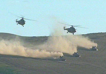 在攻打恐怖分子营地、围歼恐怖分子的实兵实弹演习中,参演的联合部队800多人对边境地区的恐怖分子营地展开了强大的攻势。空中直升机盘旋攻击,地面坦克、装甲车和步兵从左、中、右三路对恐怖分子实施围剿,远方炮兵强大的火力摧毁恐怖分子营地内的堡垒,压制着恐怖分子的火力,不时有导弹呼啸而过,准确地击中恐怖分子的指挥地点。特种反恐分队在模拟国境线上空降,截断恐怖分子的越境逃逸之路。