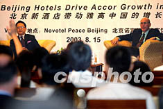 法国雅高亚太区董事行政总经理艾森柏(右)十五日在北京宣布,包括中国首家国际经济性酒店天津宜必思在内的九家酒店即将在中国开业。他表示“非典”并没有降低中国未来发展潜力,这是拓展中国酒店网络最有利的时刻。中新社记者:郑萍萍